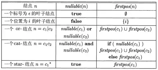 - firstpos(n)定义了以结点n为根的子树中的位置集合。这些位置对应于以n为根的子表达式的语言中某个串的第一个符号。