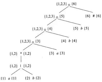 - 。在由n对应的正则表达式生成的像aa这样的串中,该串的第一个位置对应于树中的位置1;在像ba这样的串中,串的第一个位置来自于树中的位置2。然而,当由n代表的正则表达式生成的串仅包含a时,这个a来自于位置3。