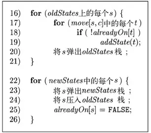 为了实现图中第一行,我们需要将alreadyOn数组中的所有条目都设置为FALSE,然后对于S中的每个状态s,将s压入oldStates并设置alreadyOn[s] 为TRUE。对状态s的操作以及图中第4行中的操作,都可以使用函数addState(s)来实现。