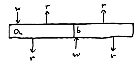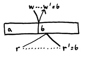 即使有了以上的保证,从独立进程的角度来看,我们的寄存器不变性也被破坏了。Top写入a,读到a,接着读到b——这不再是它写入的值。 我们必须使一致性模型更宽松来有效描述并发。现在,进程可以从其他任意进程读到最近写入的值。寄存器变成了两个进程之间协调的地方:它们共享了状态。
