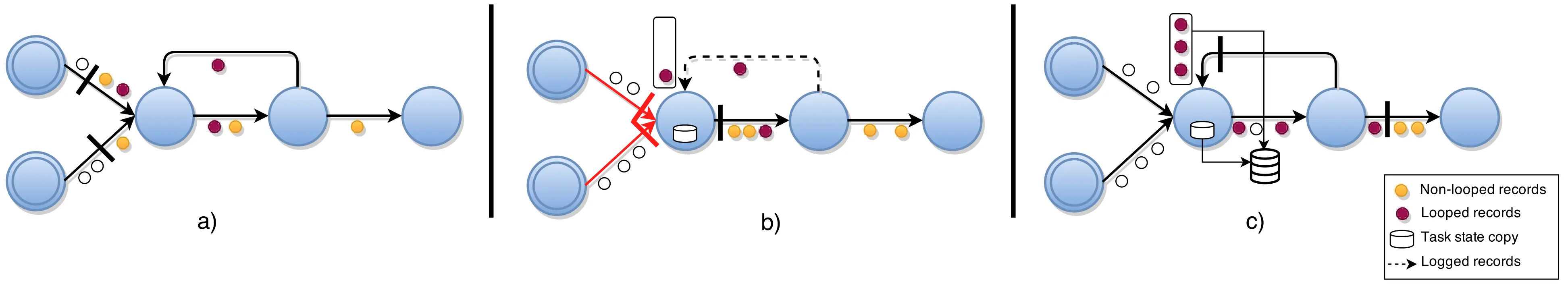 - 如图中c,所有循环中的pre-shot records和状态的备份都被作为快照的一部分。意味着最终的全局状态 包含所有task状态和仅在传输中的back-edge records