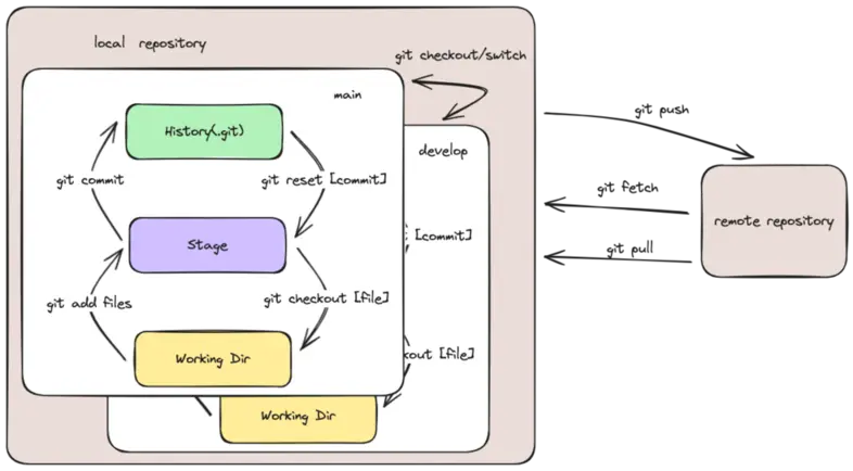 git commit:将暂存区域的文件提交到Git仓库。git reset [commit]: 用来撤销修改、回退版本的指令。git checkout/switch [branch]: 用于切换本地仓库的分支git push: 将本地仓库推送到远程仓库,同步版本库。git fetch/pull: 从服务端更新到本地,区别是git pull多了一个步骤,就是自动合并更新工作区。