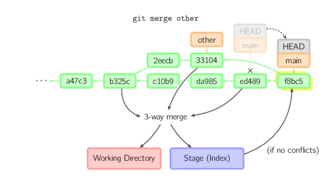 否则就是一次真正的合并。默认把当前提交(ed489 如下所示)和另一个提交(33104)以及他们的共同祖父节点(b325c)进行一次三方合并。结果是先保存当前目录和索引,然后和父节点33104一起做一次新提交(f8bc5)。
