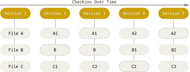 Git 和其它版本控制系统的主要差别在于 Git 对待数据的方式。 从概念上来说,其它大部分系统以文件变更列表的方式存储信息,这类系统将它们存储的信息看作是一组基本文件和每个文件随时间逐步累积的差异(它们通常称作 基于差异(delta-based)的版本控制)。