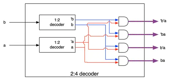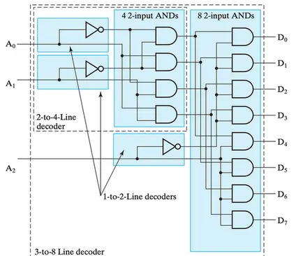 在这类电路设计中,2个2线-4线解码器的使能输入都来自于第3个输入端,这一输入在2个2线-4线解码器间起到了选择器的作用。这使得第3个输入端可以使2个解码器中的任何一个工作,其中第一个解码器产生输出D(0)至D(3),第二个解码器产生输出D(4)至D(7)。因此,将第3个输入端作为2个解码器共享的输出就能组成1个3线-8线解码器,能产生8个输出。包含使能输入的解码器又称解码器-多路分配器。
