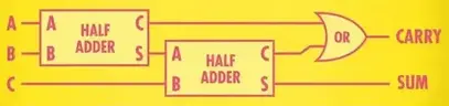 在上图中A0-A3(低位到高位)代表4位二进制数A,B0-B3(低位到高位)代表4位二进制数B。S0-S3(低位到高位)代表A+B的总和,C4代表A+B的进位,如果C4没有得到处理,那么C4也常被称为溢出,为了处理溢出,可以考虑增加位数。