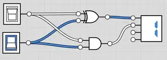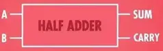 上图所示电路被称为半加器,有两个输入(A和B),和两个输出(半加和数,进位数); 所谓半加就是不考虑进位的加法.半加器虽能产生进位值,但半加器本身并不能处理进位值(上图右边接了一个数值显示器,这个显示器是支持进位的),抽象表示如下图。