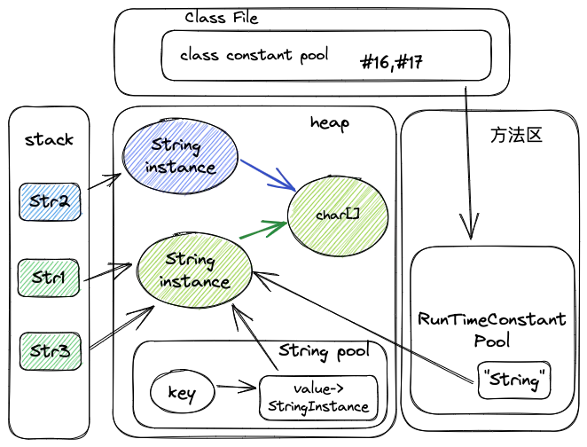 这是因为构造字符串对象str时,该对象只存在于heap中,没有放入字符串常量池。调用intern方法后,会在字符串常量池中记录hash("string")-> String instance这样的kv结构,当再次声明str2时,直接返回的是字符串常量池中记录的oop。