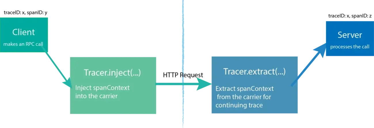 OpenTracing规范中三个关键且互连的类型Tracer、Span和SpanContext。为了在分布式系统中跨进程边界进行跟踪,服务需要能够继续由发送每个请求的客户端注入的跟踪。OpenTracing 通过提供将span的上下文编码到载体中的注入和提取方法来允许这种情况发生。Inject方法允许将SpanContext传递给运营商。例如,将跟踪信息传递到客户端的请求中,以便将其发送到的服务器可以继续跟踪。Extract方法的作用恰恰相反。它从载体中提取SpanContext。例如,如果客户端上有一个活动请求,则开发人员必须使用Extract方法提取 。