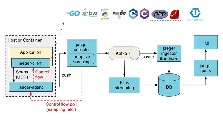 - Jaeger Client - 为不同语言实现了符合 OpenTracing 标准的 SDK。应用程序通过 API 写入数据,client library 把 trace 信息按照应用程序指定的采样策略传递给 jaeger-agent。