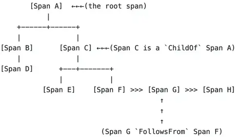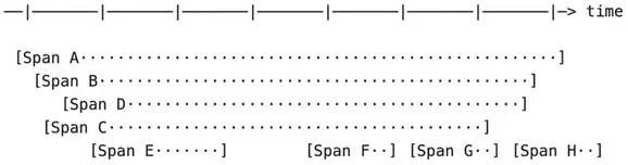 trace用于标识每层完成的工作量,同时通过使用发生前语义来保留因果关系。上图显示了分布式系统中单个请求的流。此请求流的trace表示形式如下图所示。trace是span的有向无环图 (DAG),其中span之间的边称为引用。