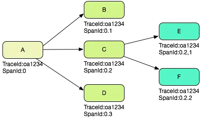 我们假设一次分布式调用中产生的 TraceId 是 0a1234(实际不会这么短),那么根据上文 SpanId 的产生过程,有下图: