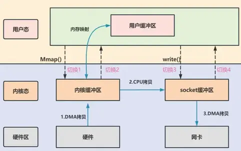 首先,期间共发生了 4 次用户态与内核态的上下文切换,因为发生了两次系统调用,一次是 read() ,一次是 write(),每次系统调用都得先从用户态切换到内核态,等内核完成任务后,再从内核态切换回用户态。上下文切换到成本并不小,一次切换需要耗时几十纳秒到几微秒,虽然时间看上去很短,但是在高并发的场景下,这类时间容易被累积和放大,从而影响系统的性能。