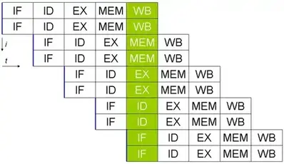 在下面的例子中,第一条指令的MEM级(第4级)之后的可用数据需要作为第二条指令的EX级(第3级)的输入。如果没有气泡,EX级(第3级)只能访问前一个EX级的输出。因此,添加气泡可以解决时间依赖性,而无需在时间上向后传播数据(这是不可能的)。