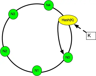 - 将所有槽位(或者节点) N0,…,Nn−1的标号 0,…,n−1依次作为 hash函数的输入(一般情况下对机器的hash计算是采用机器的IP或者机器唯一的别名作为输入值)进行哈希, 把结果分别标记在环上。