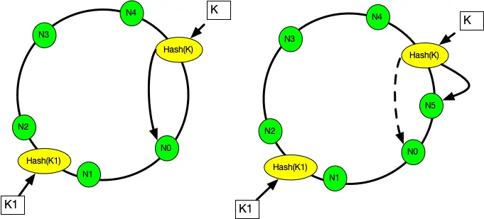- 移除节点的情况: 每一个节点在执行写请求时,都会写一个备份到顺时针的邻居节点。 这样,当 N5节点因故障需要踢除时,新的请求会交接给它的邻居节点 N0, N0上有 k的备份数据,可以正常读到。